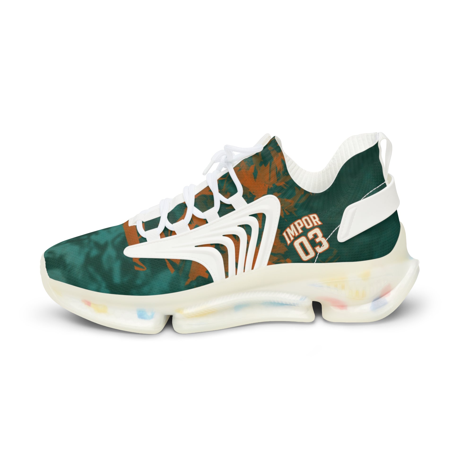 The Axolotls just called—they want their swagger back. The IMP-03 Velocity drops pro-grade tech into a silhouette that looks equally at home sprinting for the bus or posting up courtside. A swirling green-and-sunset camo screams team spirit, while sculpted KPU side ribs tip the cap to the vintage turf trainers athletes actually hooped in before sneaker culture put them behind glass. Lace up and turn every sidewalk into your highlight reel.