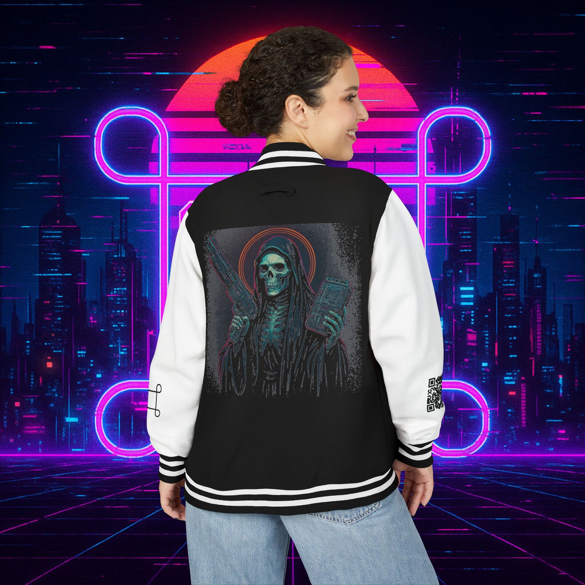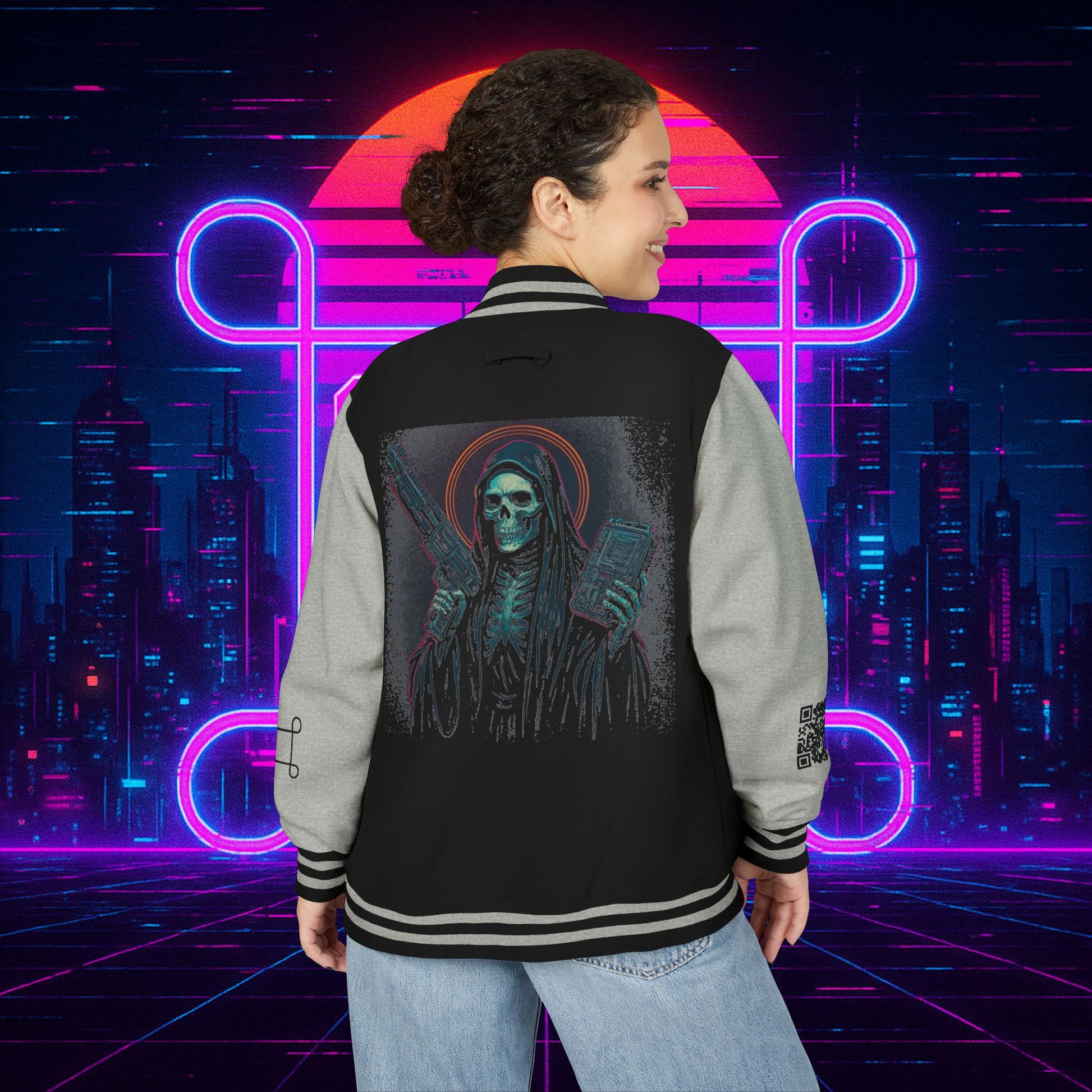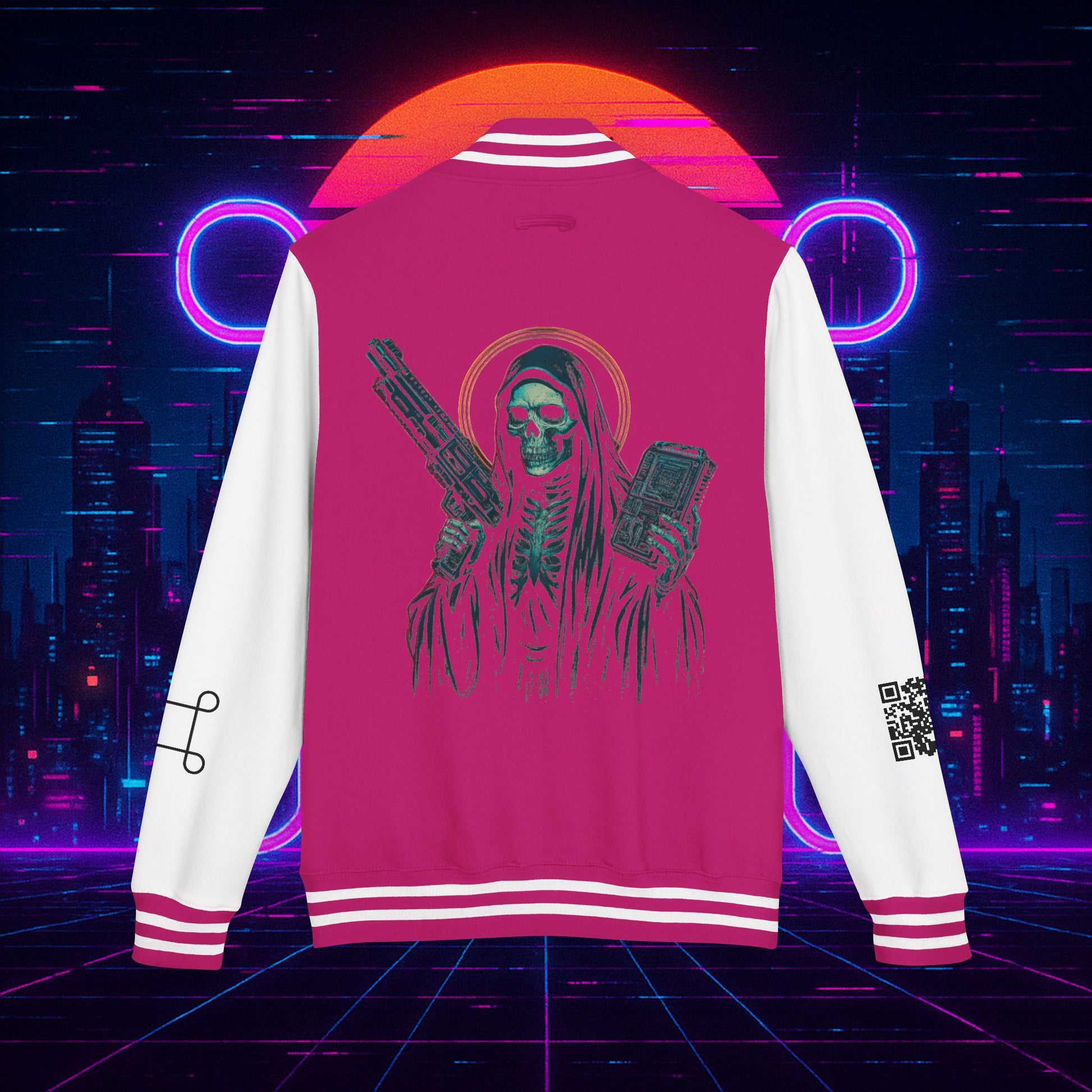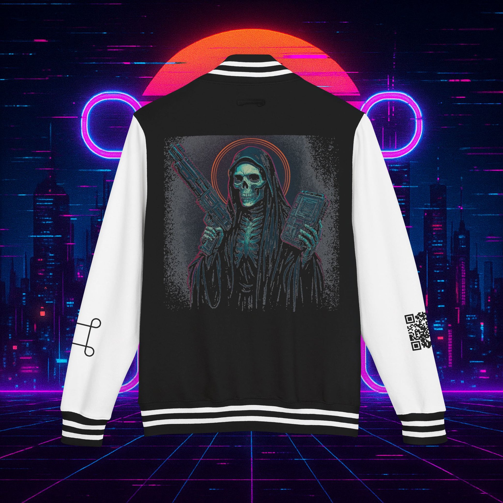 Crafted with a bold varsity silhouette, it’s the kind of piece that feels like it belongs both courtside and in the back alleys of Night City. Embroidered CTRL + EGO insignia on the front sets the tone, while the back erupts with our cyberpunk Santa Muerte with her hood drawn, neon halo burning, shotgun in one hand and cyberdeck in the other. This isn’t just outerwear, it’s armor for the digital age.