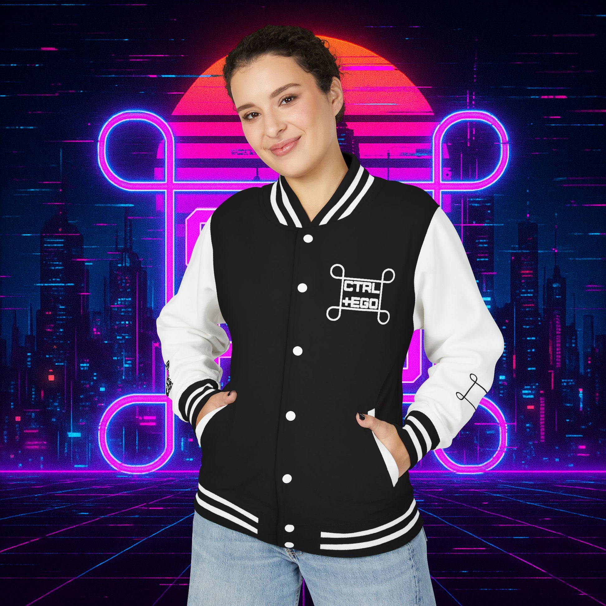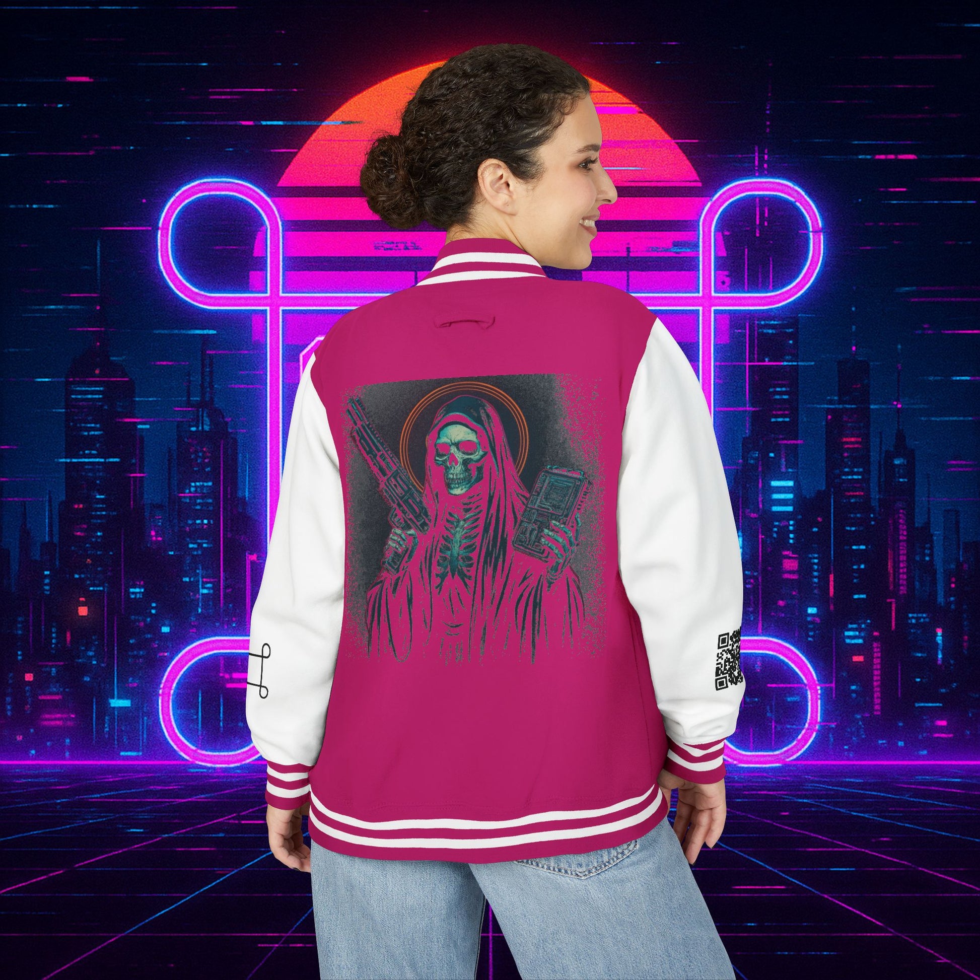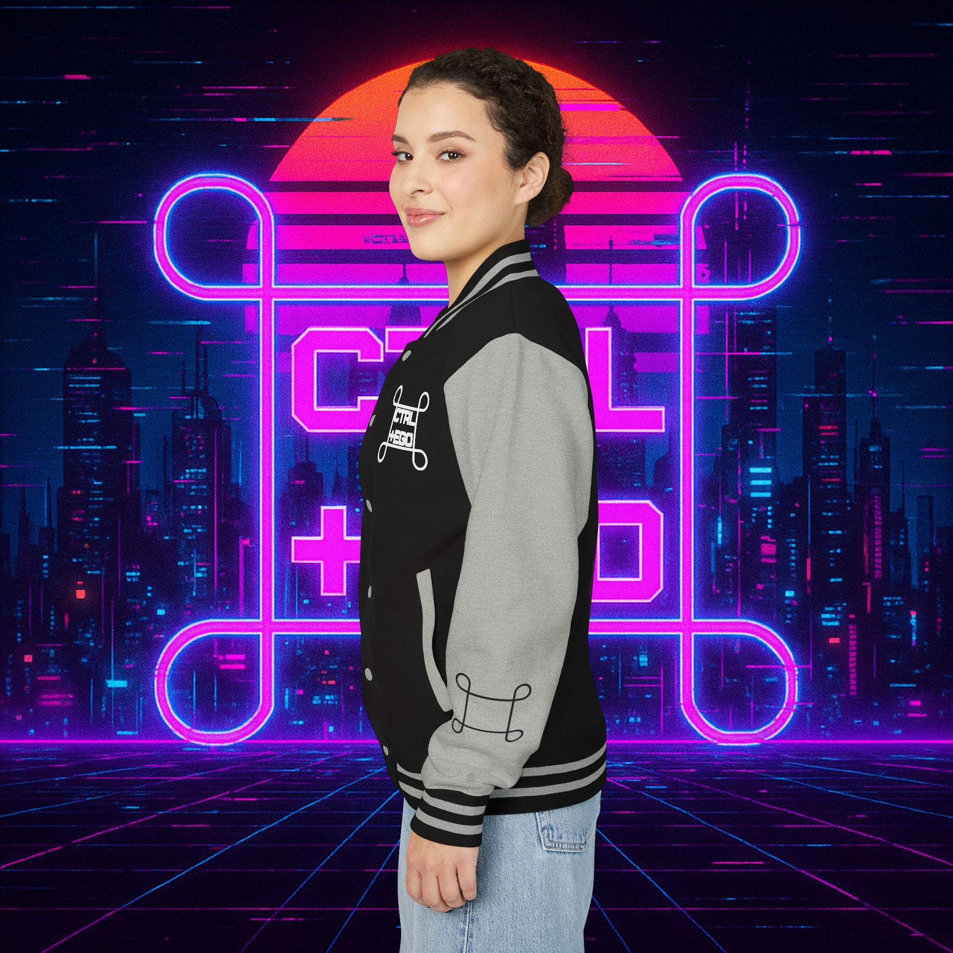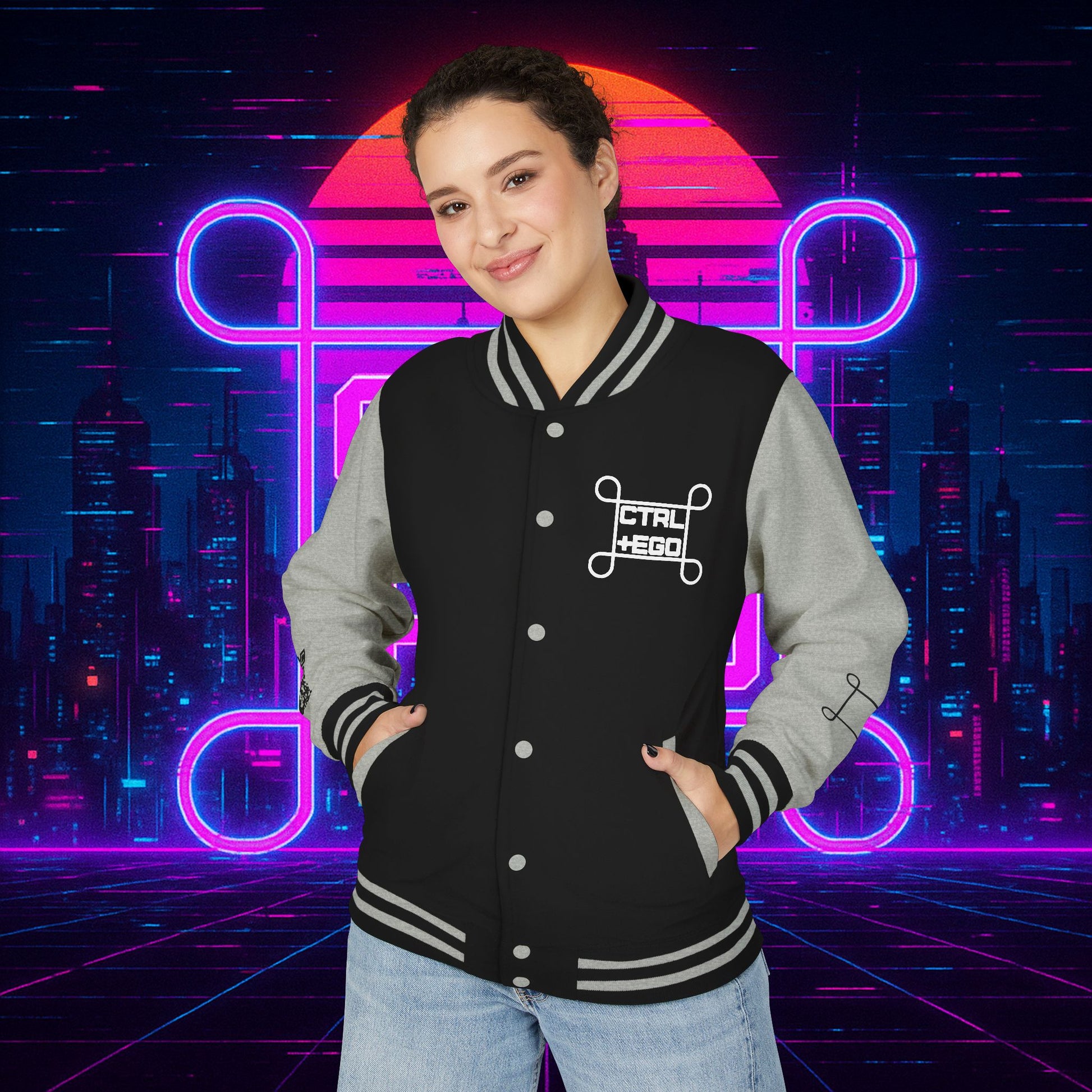 Crafted with a bold varsity silhouette, it’s the kind of piece that feels like it belongs both courtside and in the back alleys of Night City. Embroidered CTRL + EGO insignia on the front sets the tone, while the back erupts with our cyberpunk Santa Muerte with her hood drawn, neon halo burning, shotgun in one hand and cyberdeck in the other. This isn’t just outerwear, it’s armor for the digital age.
