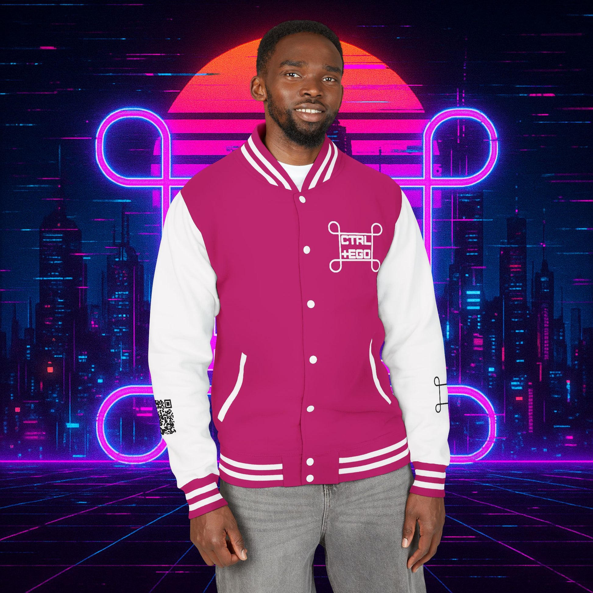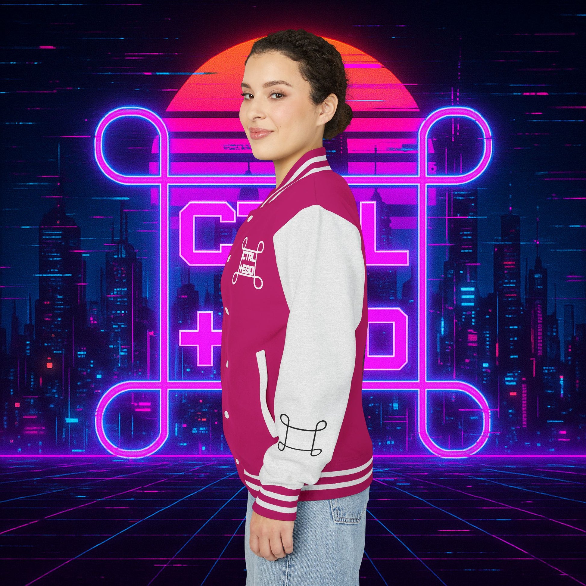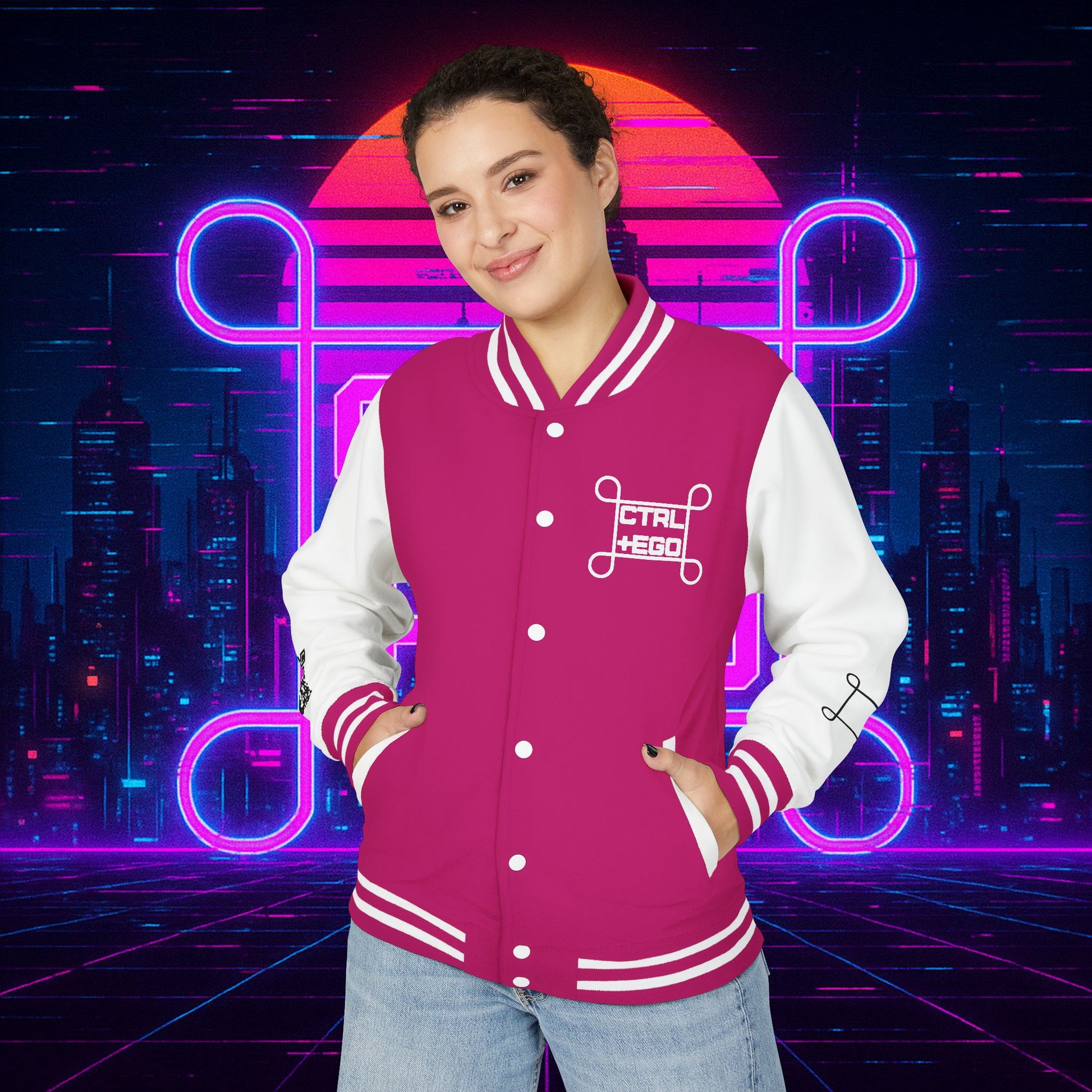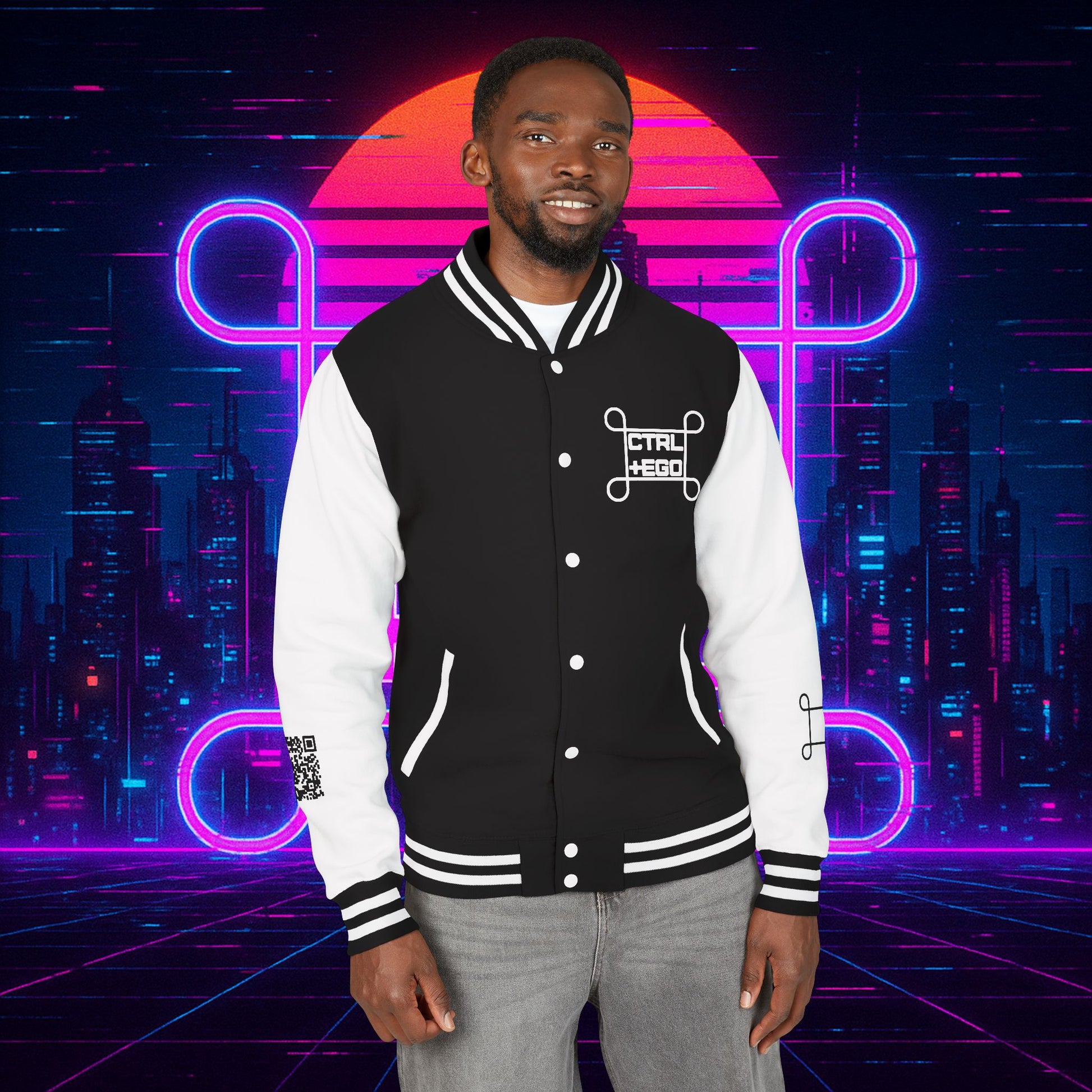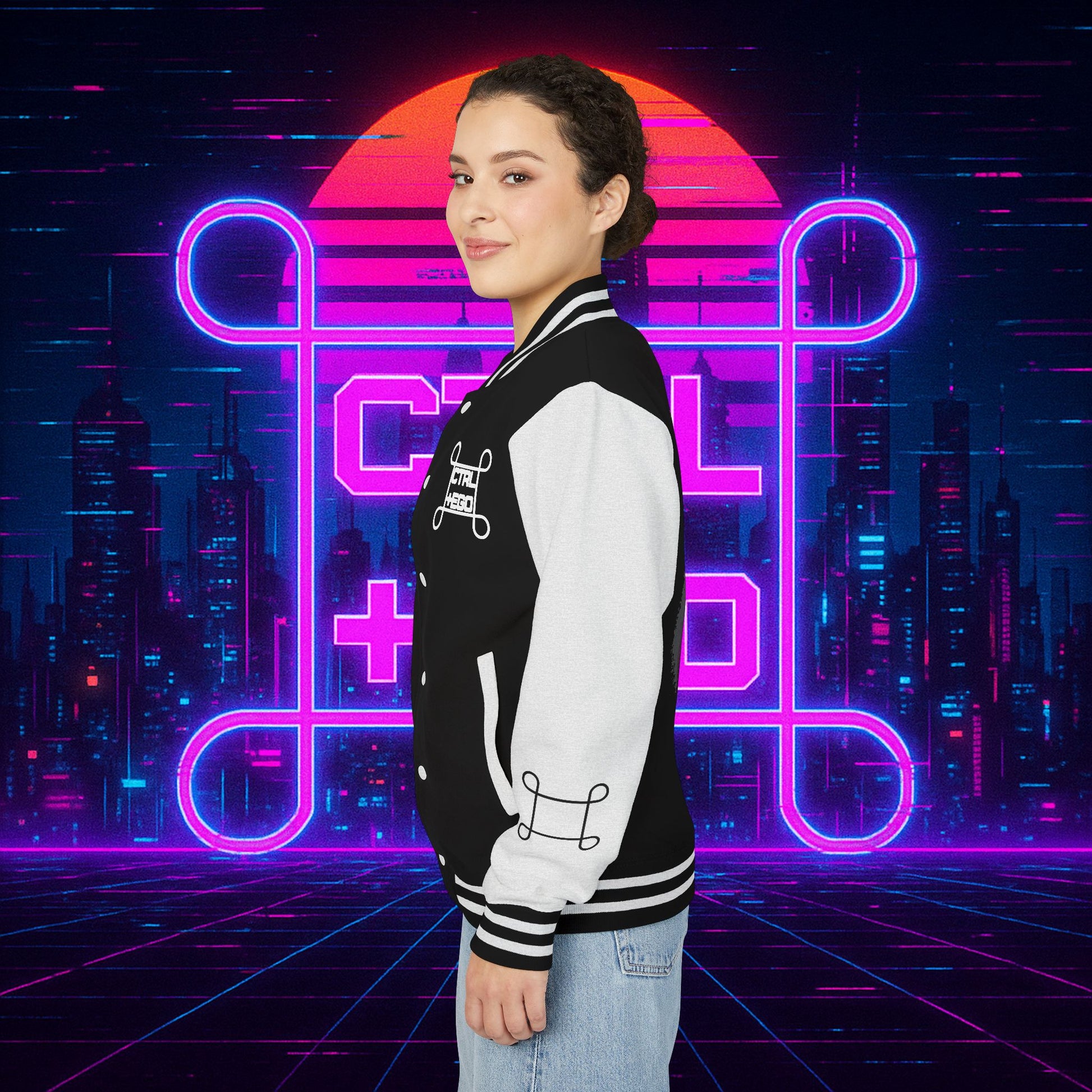 Crafted with a bold varsity silhouette, it’s the kind of piece that feels like it belongs both courtside and in the back alleys of Night City. Embroidered CTRL + EGO insignia on the front sets the tone, while the back erupts with our cyberpunk Santa Muerte with her hood drawn, neon halo burning, shotgun in one hand and cyberdeck in the other. This isn’t just outerwear, it’s armor for the digital age.
