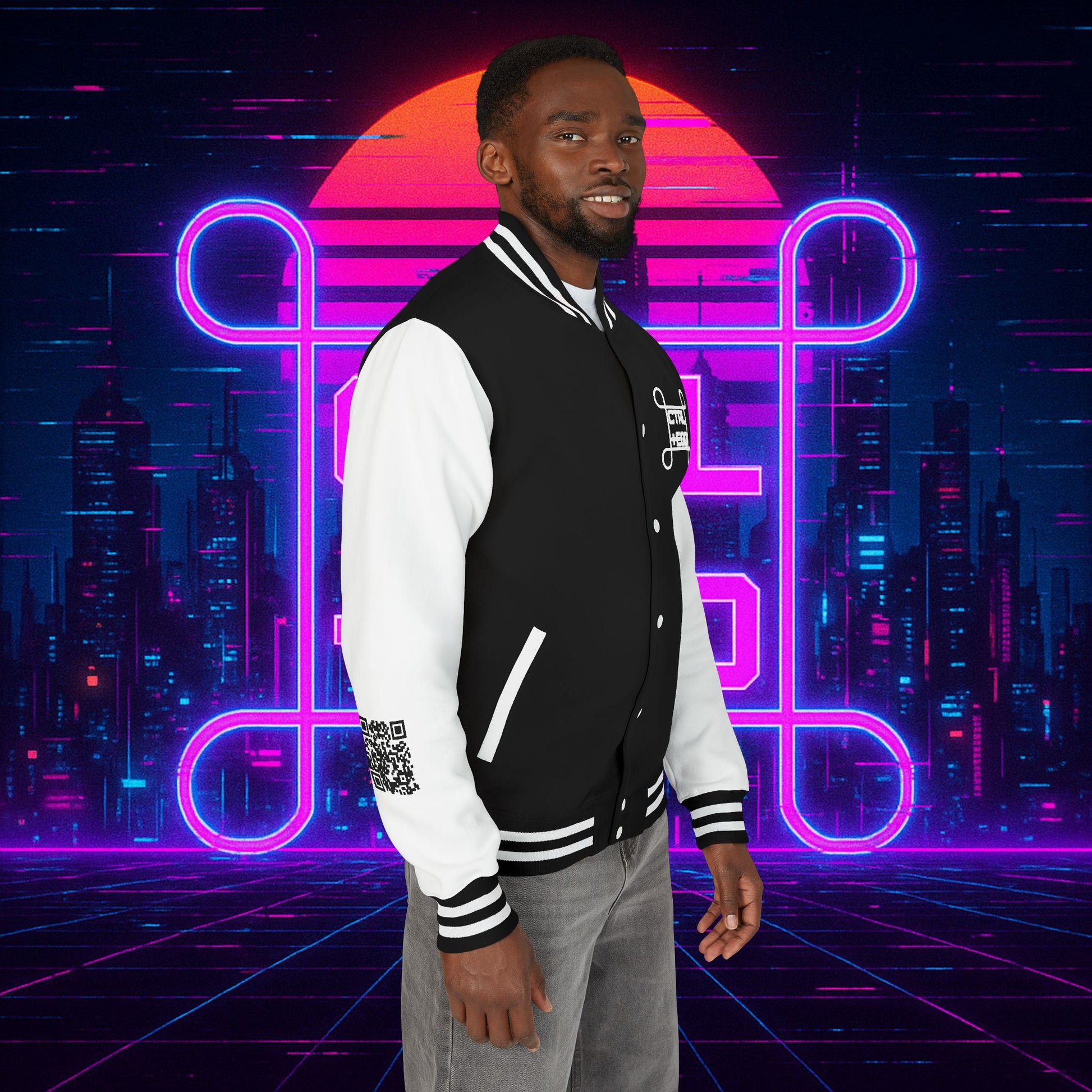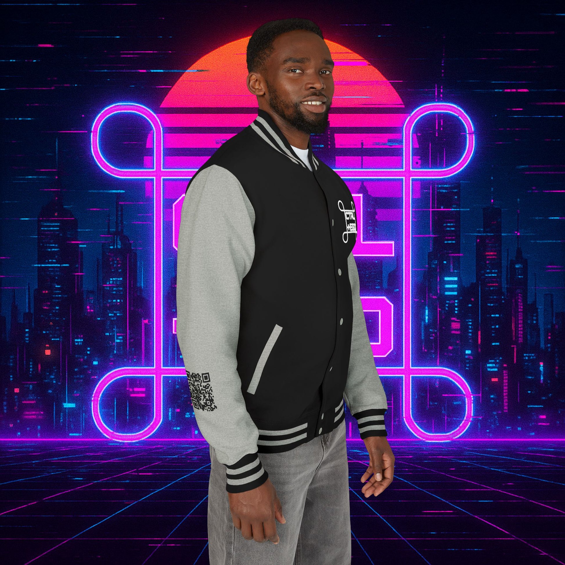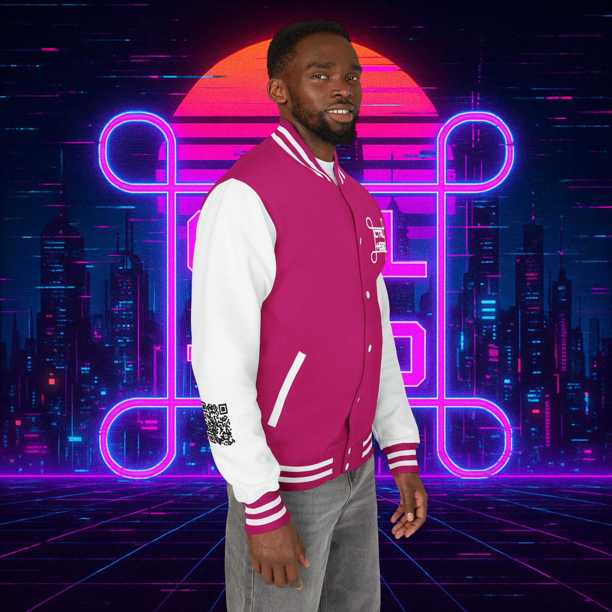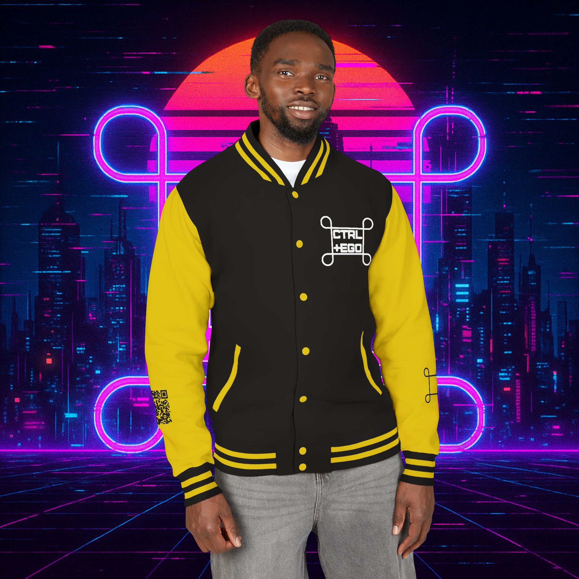 Crafted with a bold varsity silhouette, it’s the kind of piece that feels like it belongs both courtside and in the back alleys of Night City. Embroidered CTRL + EGO insignia on the front sets the tone, while the back erupts with our cyberpunk Santa Muerte with her hood drawn, neon halo burning, shotgun in one hand and cyberdeck in the other. This isn’t just outerwear, it’s armor for the digital age.